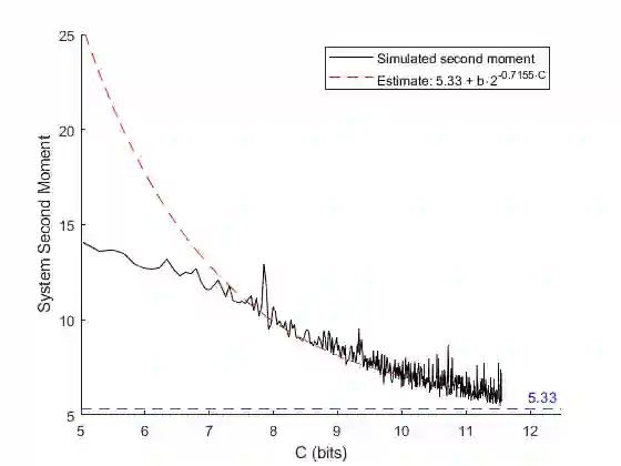It is known that under fixed-rate information constraints, adaptive quantizers can be used to stabilize an open-loop-unstable linear system on $\mathbb{R}^n$ driven by unbounded noise. These adaptive schemes can be designed so that they have near-optimal rate, and the resulting system will be stable in the sense of having an invariant probability measure, or ergodicity, as well as boundedness of the state second moment. Although structural results and information theoretic bounds of encoders have been studied, the performance of such adaptive fixed-rate quantizers beyond stabilization has not been addressed. In this paper, we propose a two-part adaptive (fixed-rate) coding scheme that achieves state second moment convergence to the classical optimum (i.e., for the fully observed setting) under mild moment conditions on the noise process. The first part, as in prior work, leads to ergodicity (via positive Harris recurrence) and the second part ensures that the state second moment converges to the classical optimum at high rates. These results are established using an intricate analysis which uses random-time state-dependent Lyapunov stochastic drift criteria as a core tool.