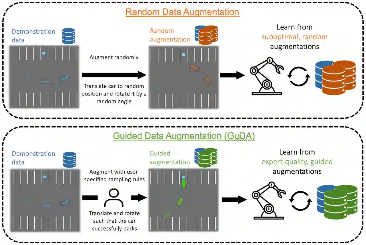 Learning from demonstration (LfD) is a popular technique that uses expert demonstrations to learn robot control policies. However, the difficulty in acquiring expert-quality demonstrations limits the applicability of LfD methods: real-world data collection is often costly, and the quality of the demonstrations depends greatly on the demonstrator's abilities and safety concerns. A number of works have leveraged data augmentation (DA) to inexpensively generate additional demonstration data, but most DA works generate augmented data in a random fashion and ultimately produce highly suboptimal data. In this work, we propose Guided Data Augmentation (GuDA), a human-guided DA framework that generates expert-quality augmented data. The key insight of GuDA is that while it may be difficult to demonstrate the sequence of actions required to produce expert data, a user can often easily identify when an augmented trajectory segment represents task progress. Thus, the user can impose a series of simple rules on the DA process to automatically generate augmented samples that approximate expert behavior. To extract a policy from GuDA, we use off-the-shelf offline reinforcement learning and behavior cloning algorithms. We evaluate GuDA on a physical robot soccer task as well as simulated D4RL navigation tasks, a simulated autonomous driving task, and a simulated soccer task. Empirically, we find that GuDA enables learning from a small set of potentially suboptimal demonstrations and substantially outperforms a DA strategy that samples augmented data randomly.