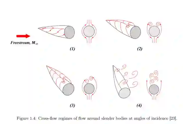 飞行器的性能评估与详细流场特性描述通常通过实验与计算相结合的方法实现。实验数据既作为气动数据库的基础,也用于数值结果的验证;而数值模拟则可提供通过实验难以获取或成本高昂的重要补充数据。因此,理解并综合运用这两种方法对开发下一代飞行器或弹丸至关重要。在飞行器研发中,细长体空气动力学发挥着巨大作用——绝大多数航空航天系统(包括运载火箭、导弹系统和喷气式飞机)均基于细长体几何构型设计。然而实际应用中的这些飞行器还包含多种气动面,这些结构会在流场中引发附加特征并导致复杂的流动相互作用。此外,这些流动特征与相互作用在宽马赫数范围内显著变化,从而导致气动性能的差异。通常涡流主导的流动多见于低速状态,而激波主导的流动则多见于高速状态。本研究聚焦于高速状态下激波与涡流共存时的流动特性分析。