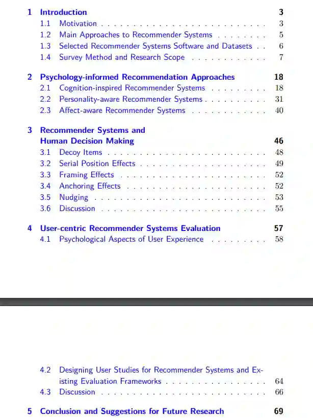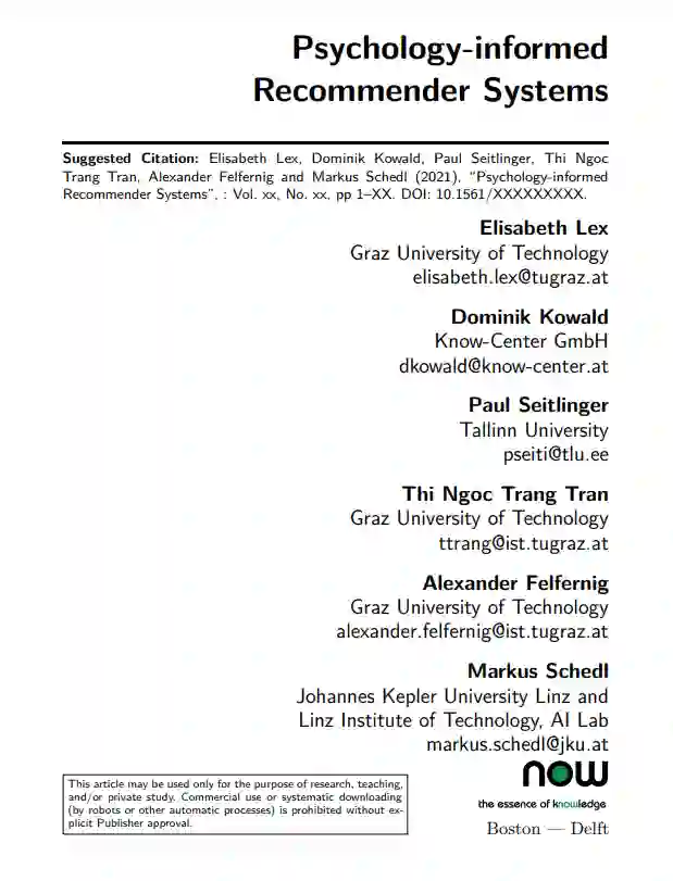 个性化的推荐系统在当今的网络世界中已经变得不可或缺。目前大多数推荐算法都是数据驱动的,基于行为数据。虽然这样的系统可以产生有用的建议,但它们通常是无法解释的黑箱模型,在算法的设计中没有纳入用户行为的潜在认知原因。本调查的目的是对利用心理结构和理论来建模和预测用户行为并改进推荐过程的推荐系统的最新技术进行彻底的回顾。我们称这种系统为心理信息推荐系统。该书确定了三类心理信息推荐系统:认知激励型、个性感知型和情感感知型推荐系统。此外,对于每个类别,我们都强调了心理学理论在其中发挥关键作用的领域,因此在推荐过程中会被考虑在内。由于推荐系统是支持人类决策的基本工具,我们还讨论了影响用户和推荐者之间交互的选择决策心理现象。此外,我们讨论了从用户角度研究推荐系统评估的相关工作,并强调了以用户为中心的评估框架。在本调查的最后,我们讨论了未来工作的潜在研究任务。**