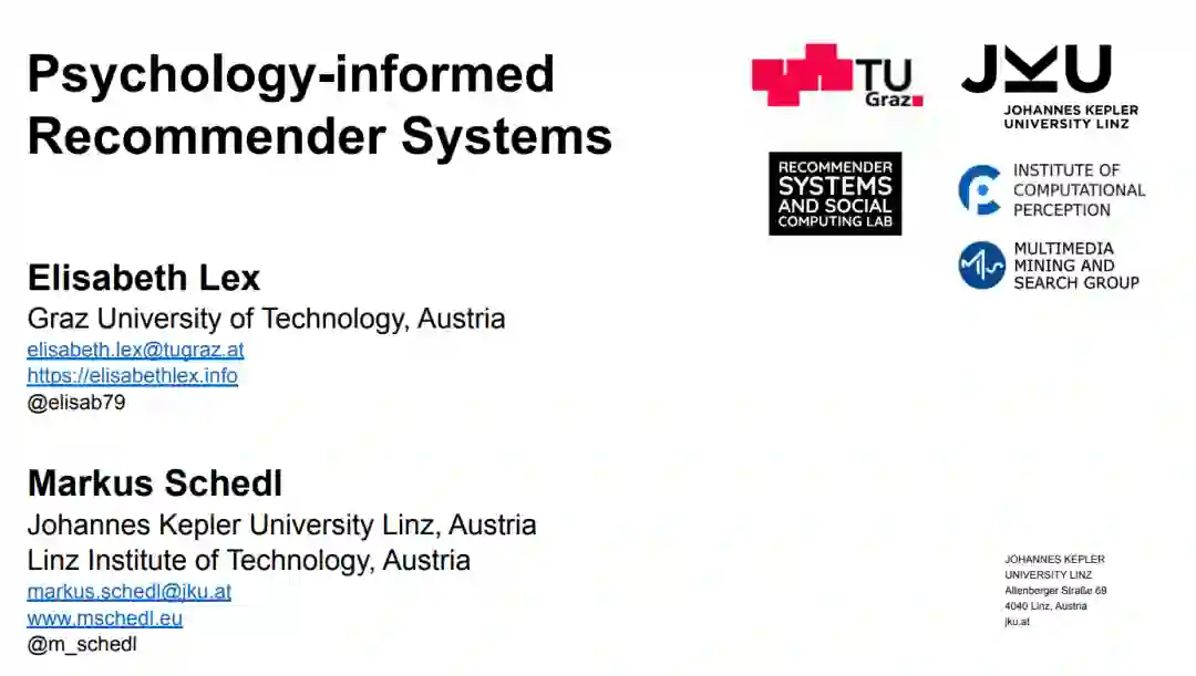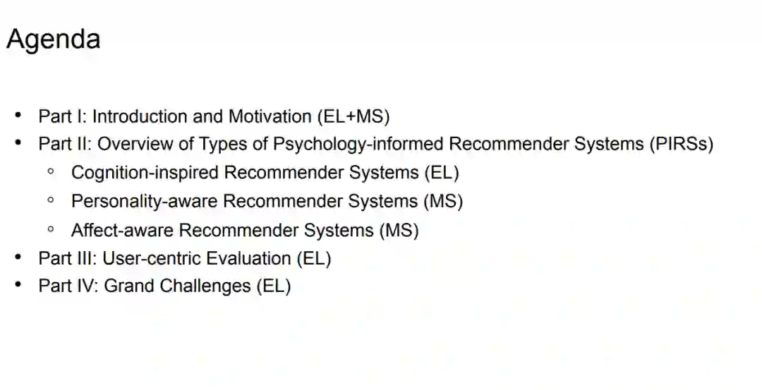 个性化推荐系统是促进人类决策的重要工具。大多数最先进的推荐系统使用先进的机器学习技术,从行为数据建模和预测用户偏好。虽然这样的系统可以提供有用的建议,但它们的算法设计没有纳入塑造用户偏好和行为的潜在心理机制。在这个跨学科的教程中,我们引导与会者通过最先进的心理学信息推荐系统(PIRS),即,考虑外在和内在的人为因素的推荐系统。我们涵盖了认知激励、个性感知和情感感知的推荐方法;我们展示了这样的系统如何以高度以人为本的方式改进推荐过程。