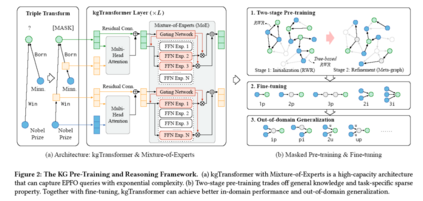 知识图谱(KG)嵌入已经成为不完备知识图谱推理的主流方法,但由于其固有的浅层和静态架构的限制,难以处理日益受到关注的复杂逻辑查询,包括逻辑运算符、imputed边、多源实体和未知中间实体。在这项工作中,我们提出了知识图谱转换器(kgTransformer),它具有掩码的预训练和微调策略。我们设计了一种KG三重变换方法,使Transformer能够处理KGs,并通过混合专家(mix -of- experts, MoE)稀疏激活进一步加强了这种方法。然后,我们将复杂的逻辑查询表述为掩码预测,并引入两阶段掩码训练前策略以提高可移植性和泛化性。在两个基准测试上的大量实验表明,kgTransformer在9个域内和域外推理任务上可以始终优于基于KG嵌入的基准和高级编码器。此外,kgTransformer可以通过提供完整的推理路径来解释给定的答案,从而具有可解释性。