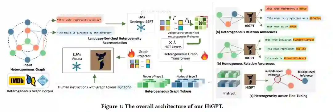 异构图学习旨在捕捉异构图中实体之间复杂的关系和多样的关系语义,以获得有意义的节点和边的表示。近期异构图神经网络(HGNNs)的进展通过考虑关系异质性并使用专门的消息传递函数和聚合规则,达到了最先进的性能。然而,现有的异构图学习框架在泛化到不同的异构图数据集时存在局限性。这些框架大多遵循在同一数据集上进行“预训练”和“微调”的范式,这限制了它们适应新数据和未见数据的能力。这引出了一个问题:“我们能否将异构图模型泛化,使其能够适应在节点标记集和关系类型异质性上存在分布变化的不同下游学习任务?”为了解决这些挑战,我们提出了HiGPT,一种基于异构图指令调优范式的通用大型图模型。我们的框架能够从任意异构图中学习,而无需对下游数据集进行任何微调过程。为了处理异质性中的分布变化,我们引入了一个上下文异构图标记器,捕捉不同异构图中的语义关系,促进模型的适应性。我们在HiGPT中结合了大量感知异质性的图指令,令模型能够有效理解复杂的关系异质性并区分各种类型的图标记。此外,我们引入了“思维混合”(Mixture-of-Thought,MoT)指令增强范式,通过生成多样且信息丰富的指令来缓解数据稀缺问题。通过在各种设置下进行的综合评估,我们提出的框架在泛化性能方面表现出色,超越了当前的领先基准。