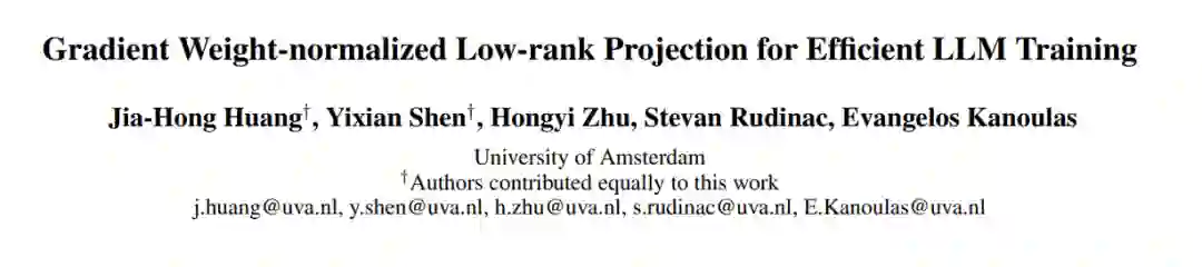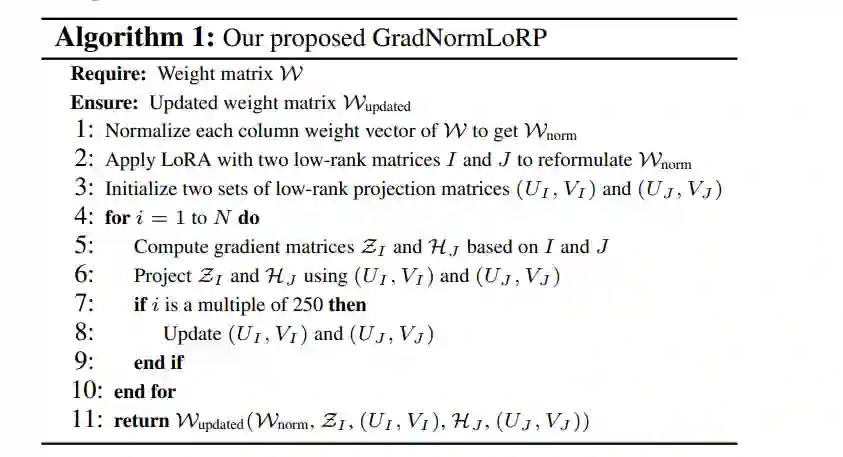 大型语言模型(LLM)在各类任务中表现出色,但对计算资源的需求不断增加,特别是在下游任务中广泛使用全量微调时,带来了显著的挑战。为了解决这一问题,已经提出了参数高效微调(PEFT)方法,但它们往往表现不如全量微调,并且在内存效率方面存在困难。在本研究中,我们提出了一种新方法——梯度权重归一化低秩投影(GradNormLoRP),它在保持与全量微调相当的性能的同时,提升了参数和内存效率。GradNormLoRP 通过归一化权重矩阵来改善梯度的条件,从而促进优化过程中更好的收敛。此外,它对权重和梯度矩阵应用低秩近似,大幅减少了训练过程中的内存使用。大量实验表明,我们的 8 位 GradNormLoRP 能够将优化器的内存使用减少最多 89.5%,并使得大规模 LLM(如 LLaMA 7B)能够在消费者级 GPU(如 NVIDIA RTX 4090)上进行预训练,而无需额外的推理成本。更重要的是,GradNormLoRP 在微调任务中优于现有的低秩方法。例如,在对 RoBERTa 模型进行所有 GLUE 任务的微调时,使用秩为 8 的 GradNormLoRP 平均得分为 80.65,超越了 LoRA 的 79.23 分。这些结果突显了 GradNormLoRP 作为一种高效 LLM 预训练和微调的有前途替代方案。
