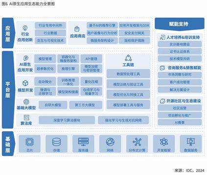 生成式AI的价值与挑战并存,构建或参与AI原生应用生态体系成为企业战略要务 生成式AI技术在赋予企业显著的效能提升与商业价值创造能力的同时,也带来了一系列待解决的风险与挑战,诸如对高性能计算资源的高需求、模型部署及优化的复杂度升高、数据管理的严谨要求提升、安全保障措施的周密布局难以保证以及紧跟技术革新步伐的的持续适应能力不足等。 为化解这些难题,确保AI技术更稳健地与实体经济融合并协同发展,业界正积极推动由孤立的AI原生应用向健全完善的AI原生应用生态系统转型。 IDC指出,这一生态系统的核心在于以AI大模型为核心支柱,通过开发和部署各类AI原生应用来串联产业链上的合作伙伴,创造新的服务模式,全产业链共同挖掘并实现商业潜能。 此生态系统涵盖生态构建主体、关键合作创新者以及各行业参与者,且随着市场需求及环境的变化,对其中所有角色的功能定位和技术要求也在不断提升: 生态构建者须开放包容,与伙伴共筑协同繁荣之路:生态构建者在系统中发挥着核心作用,在生成式AI时代下需展现出更为开放包容的姿态,积极倡导并鼓励各合作伙伴及客户间形成紧密协同效应,各自发挥核心优势,共同砥砺前行,推动AI原生应用生态系统的繁盛壮大。 生态关键共创者须深思定位,深化合作以推动AI应用革新:生态关键共创者是生态系统中的重要合作伙伴,其角色定位不应止步于简单的“信息传递者”,而应深入挖掘自身潜力,进行战略性的思考与革新。通过与生态系统内部其他伙伴开展深度合作和资源共享,多方合力促进AI原生应用领域的深化拓展和技术进步,实现互惠互利的长远发展目标。