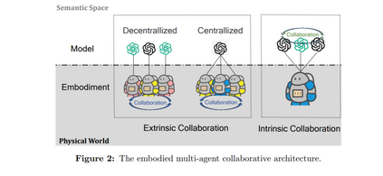 在去中心化策略中,每个模型独立控制其相应的具身实体,从而提供更大的灵活性和可扩展性。早期的研究使用强化学习进行去中心化控制,但基础模型(FM)的兴起使得智能体能够自主处理多样化的任务 [CJ+24],形成了更为先进的去中心化系统。 基础模型通过利用推理能力来增强去中心化系统,基于局部部分观察来改善个体决策。例如,[ZWL+24] 利用世界模型来辅助多智能体规划,在该模型中,每个个体通过世界模型预测其他智能体的行为,并推断自己的计划。类似地,[AF+23] 引入了一个辅助的心智理论推理基础模型来解释合作伙伴智能体的行动和需求,从而支持个体决策。 此外,凭借基础模型的推理和通信能力,基于FM的智能体表现出涌现的社交性。[CJ+23] 发现,当没有明确指导采用哪种策略时,FM驱动的智能体主要遵循平均策略,这代表了智能体之间的一种平等主义组织结构。其他研究 [GHL+24, CJ+24] 强调了团队中更为结构化角色的潜在好处。这表明,类似于人类的社会结构,FM智能体可以表现出涌现行为,通过适应组织框架来优化协作,从而增强它们在处理复杂任务时的集体能力。