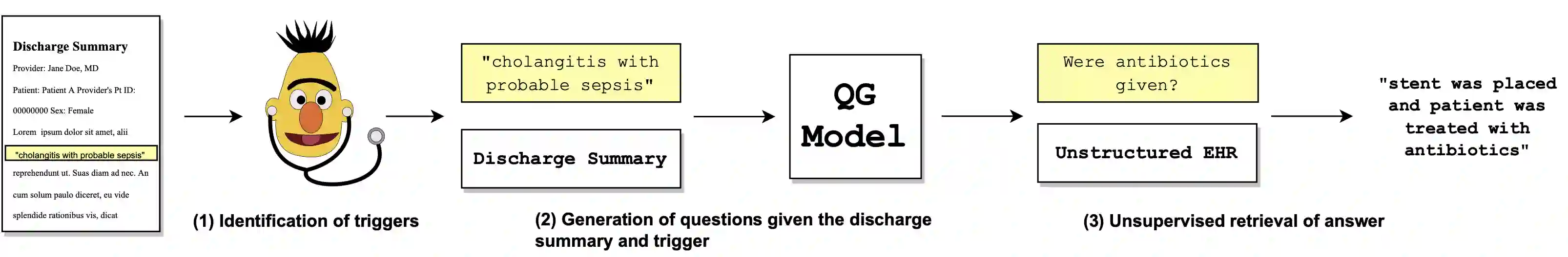 现有的源自电子健康记录(EHR)的问题回答(QA)数据集是人为生成的,因此不能捕捉到真实的医生信息需求。我们提出了出院总结临床问题(DiSCQ),这是一个新策划的问题数据集,由2,000多个问题与提示每个问题的文本片段(触发器)搭配而成。这些问题是由医学专家从100多个MIMIC-III出院总结中产生的。我们分析了这个数据集,以确定医学专家所寻求的信息类型的特点。我们还训练了触发器检测和问题生成(QG)的基线模型,与EHR上的无监督答案检索相搭配。我们的基线模型能够在超过62%的情况下生成高质量的问题,这些问题是由人类选择的触发器提示的。我们发布了这个数据集(以及重现基线模型结果的所有代码),以促进对现实的临床质量保证和QG的进一步研究。