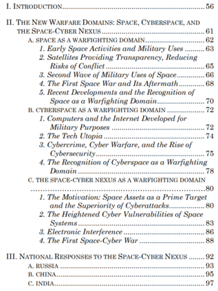下文第二节回顾了太空--最初保留用于和平目的--作为一个作战领域的出现,网络空间作为一个作战领域的出现,以及最终太空-网络关系作为一个作战领域的出现。然后,第三节回顾了各国正在采取的应对太空-网络关系的措施,包括针对脆弱性和风险出台政策和标准。在讨论国家应对措施之后,将讨论国际层面的应对措施。第四节讨论了太空、网络空间和太空-网络关系等新战争领域的战争法,表明迫切需要采取综合的多边制度。第五节紧随其后,提出多轨国际立法是为太空-网络战争领域引入多边规范和规则的可行途径。这强调了一种多中心的方法,包括多个部分重叠的论坛(包括多方利益攸关方论坛),并主要介绍了不具约束力的国际协定和其他文书,总体而言,这些协定和文书有助于达成共识和建立规范。第六节总结了本文的主要观点。