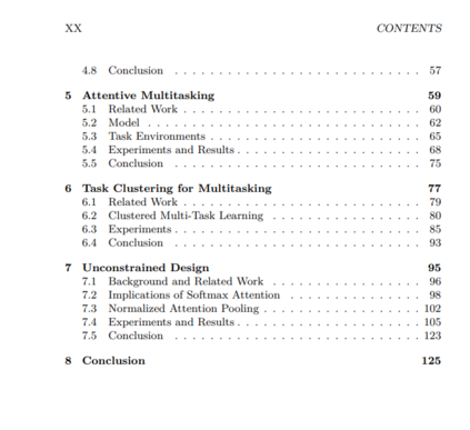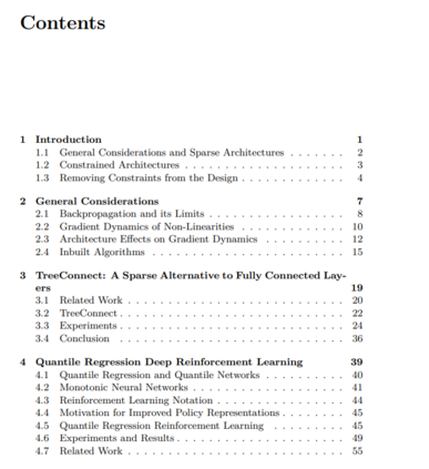 特别地,本文首先强调了反向传播的隐式内存需求、常用激活函数的工作范围以及体系结构组件对梯度传播的影响。展示了架构瓶颈和门控机制如何导致梯度消失,并讨论了残差连接对梯度动态的影响。它还强调了通过体系结构提供算法结构的必要性,以及结构和有利的训练动态之间的内在权衡。在第一个实际示例中,本文提出了一种全连接层的稀疏替代方案,可以减少参数计数,而不会引入不必要的瓶颈。在强化学习方面,本文提出了一种在连续动作空间环境中控制的新方法。该方法基于分位数回归和神经网络的单调性约束。这种组合允许在网络参数中隐式地表示策略,从而提供了表示复杂动作分布的灵活性。这种策略的必要性在竞争游戏和约束内存设置中得到了证明。此外,该方法还提高了经典控制问题的学习性能。本文进一步探讨了多任务学习的局限性,并针对干扰任务目标的问题提出了两种解决方案——一种是基于注意力架构先验的解决方案,另一种是基于与无监督任务聚类配对的神经网络解决方案。这两种方法都有效地缓解了这个问题,从而提高了性能,并在不同的环境中具有更广泛的适用性。 本文最后深入研究了注意力架构和transformer对超参数的敏感性。它强调了将注意力权重约束到概率单形的含义,以及这些如何反映训练表现。它进一步展示了内部softmax激活如何像sigmoid一样容易饱和,以及transformer在初始化时如何不是序列长度独立的。在对抽象任务的大规模实证研究中,将Transformer与可选架构设计进行比较。结果突出了超参数选择的相关效应,不同架构对数据偏差的鲁棒性,以及算法对齐对底层任务的重要性。