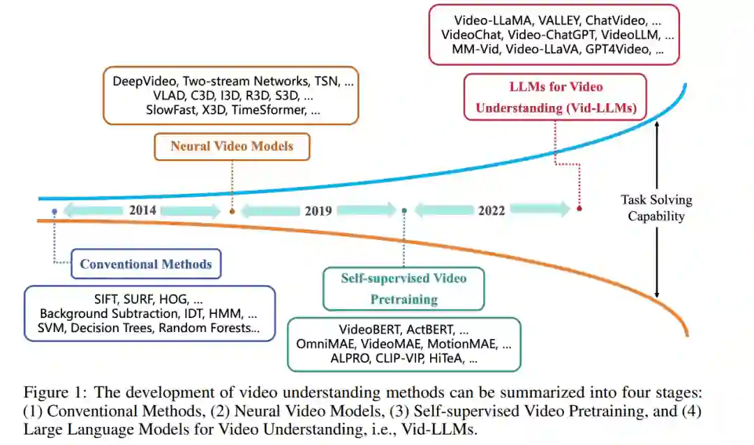 正如图1所示,视频理解方法的演变可分为四个阶段: 传统方法。在视频理解的早期阶段,使用了手工特征提取技术,如尺度不变特征变换(SIFT)[1]、加速稳健特征(SURF)[2]和定向梯度直方图(HOG)[3]来捕捉视频中的关键信息。背景减除[4]、光流方法[5]和改进的密集轨迹(IDT)[6, 7]用于跟踪建模运动信息。由于视频可以被视为时间序列数据,因此也使用了隐藏马尔可夫模型(HMM)[8]等时间序列分析技术来理解视频内容。在深度学习普及之前,也使用了基本的机器学习算法,如支持向量机(SVM)[9]、决策树和随机森林,用于视频分类和识别任务。集群分析[10]用于分类视频段落,或主成分分析(PCA)[11, 12]用于数据降维,也是视频分析中常用的方法。