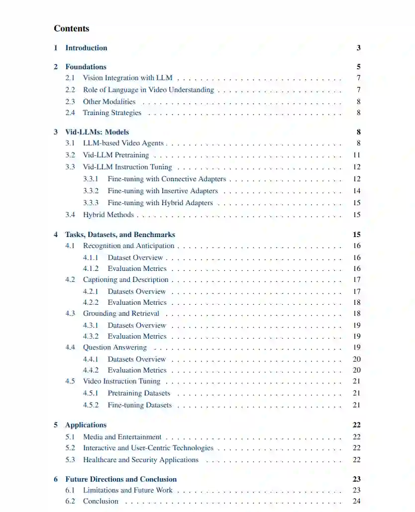 本综述结构如下:第2节提供了全面概述,强调利用LLMs能力的方法,并详细介绍这些方法解决的具体任务和数据集。第3节深入探讨了利用LLMs进行视频理解的最新研究,介绍了它们在该领域的独特方法和影响。第4节提供了各种任务、相关数据集和评估指标的详细总结和分析。第5节探索了Video-LLMs在多个重要领域的应用。综述在第6节总结关键发现,并识别未解决的挑战和未来研究的潜在领域。