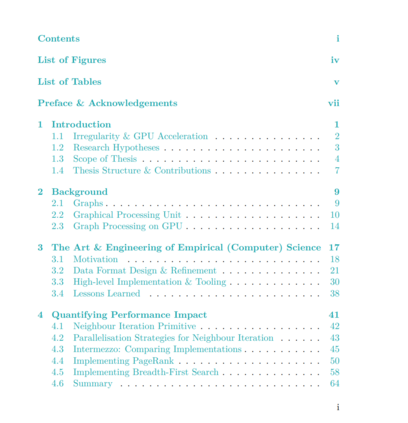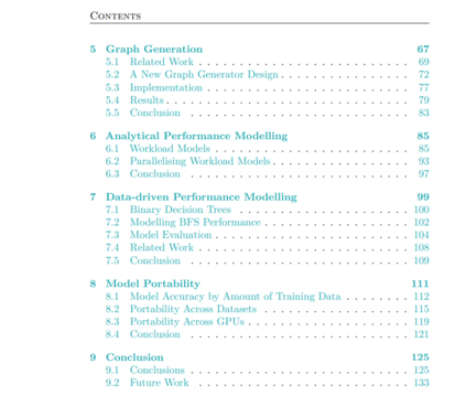 第2章概述了图形、GPGPU编程和gpu上的图形处理。为本文的后续讨论提供必要的背景资料。最重要的是,本文更详细地概述了现代GPU中存在的设计权衡,以及这些权衡如何限制我们对图处理的实现选择。第3章在第17页讨论了经验计算机科学的再现性困难,重点是图处理中的困难。本文介绍了发表在[89]中的软件工具链,我们构建了该工具链,用于收集图算法的性能数据,对这些结果进行数据分析,并根据经验数据评估模型。在第4章中,我们将讨论相邻迭代可能的并行化策略,以及如何使用相邻迭代来实现PageRank和BFS算法。我们使用第17页第3章中的工具链来量化不同并行化策略对PageRank(发表在[92,93])和BFS(发表在[94])性能的影响。第5章第67页介绍了我们基于进化计算的图生成器,发表在[95]。我们构建这个生成器作为概念验证,以为我们的实验生成输入图。然而,由于工程时间的实际限制,我们最终放弃了这种方法,而选择使用真实的数据集。第6章介绍了发表在[94]中的分析工作量模型,用于描述第41页第4章中的并行化策略。这些分析模型不足以准确预测这些算法在GPU上的并行性能。在第7章中,我们展示了如何使用第3章中的工具链来创建二叉决策树(BDT)模型,该模型可以让我们预测给定输入图的算法的最佳实现,发表在[92,93]。此外,还证明了可以通过在遍历期间使用BDT模型动态切换实现来加快BFS遍历。第111页的第8章分析了我们的BDT模型跨数据集和GPU架构的可移植性,发表在[90]中。分析表明,所提出实现的性能特征在GPU架构和数据集上基本稳定。