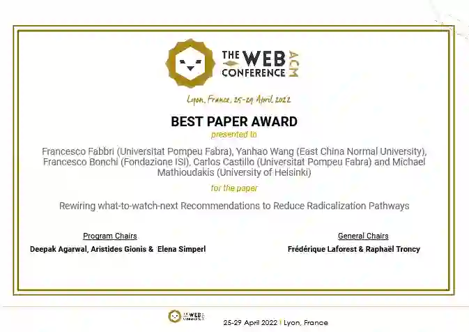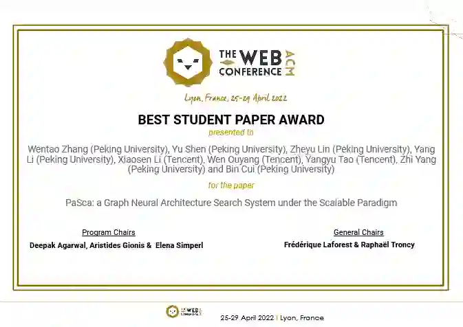 【导读】2022年国际万维网大会The Web Conference(旧称WWW)将于2022年4月25日-29日召开。TheWebConf是中国计算机学会(CCF)推荐的A类国际学术会议,是互联网技术领域最重要的国际会议之一,由国际万维网会议委员会(IW3C2)和主办地地方团队合作组织,每年召开一次,今年的 WWW 将于4月25-29日在法国里昂以线上会议的形式召开。本届会议共收到了1822篇长文投稿,论文录用率为17.7%。刚刚最佳论文一系列奖项出炉了!来自西班牙庞培法布拉大学改善激进推荐《Rewiring What-to-Watch-Next Recommendations to Reduce Radicalization Pathways》获得最佳论文,北京大学与腾讯《PaSca: a Graph Neural Architecture Search System under the Scalable Paradigm》获得最佳学生论文!