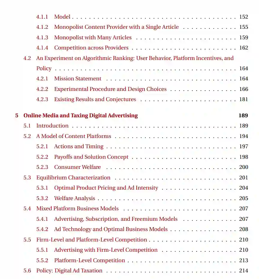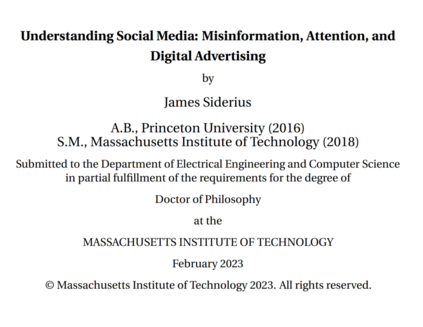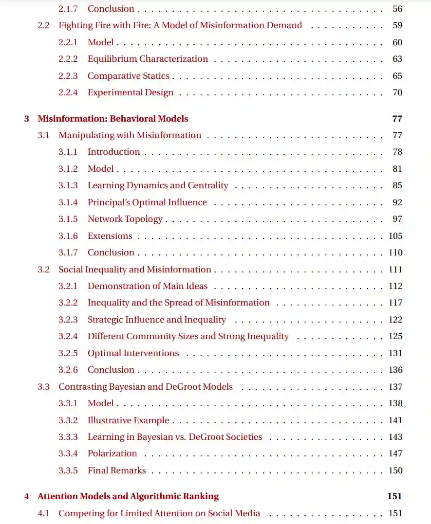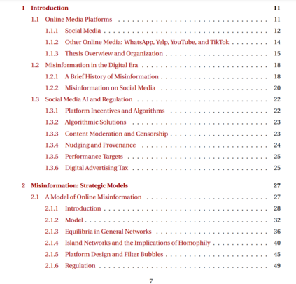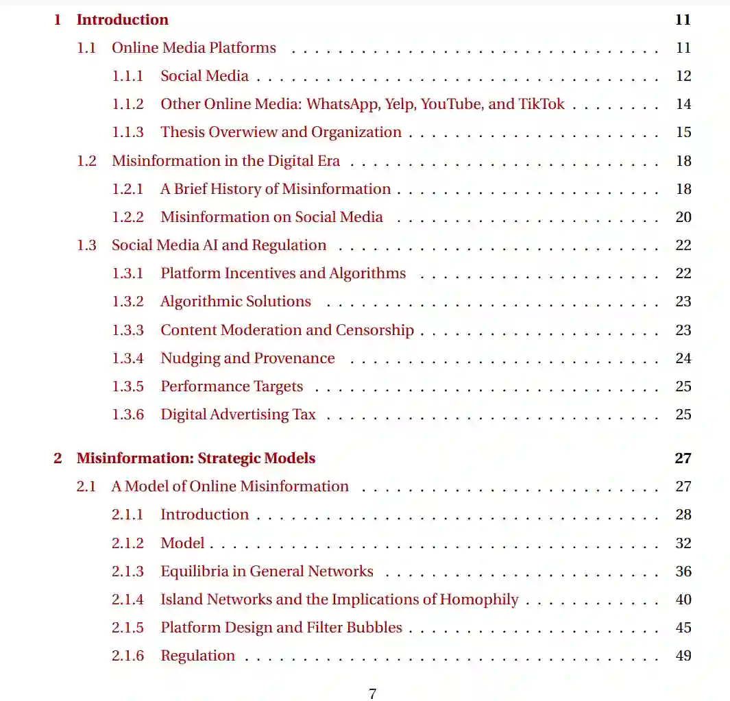 在线平台从根本上改变了社交互动和信息传播的动态。在本论文中,我通过对用户行为、平台算法与激励、以及政策倡议的模型和实验,探讨了社交媒体的最新趋势。我关注新通信技术的社会后果,其预期和非预期的社会影响,以及如何引导它们朝更有社会利益的方向发展。**近年来,社交媒体已成为虚假信息的滋生地,但虚假信息传播的原因仍未完全理解。**首先,我讨论了社交媒体在虚假信息传播中的作用,潜在的平台算法如何加剧其影响,并分析了纠正虚假信息传播的各种政策。社交媒体带来的技术进步也使用户能够系统地获取海量信息;然而,这项技术在多大程度上实际上有助于更好地获取信息仍不清楚。在论文的第二部分,为了描述数字内容的景观,我提出了一个关于有限注意力用户在数字平台上进行内容创作和消费的模型,并讨论了与算法排名在用户参与度方面的作用相关的实验。最后,我们注意到,在线平台的商业模式在很大程度上驱动了内容创作和平台算法选择,并最终影响人机互动。论文的最后部分讨论了媒体平台的各种商业模式,它们对消费者福利的影响以及可能的补救措施。