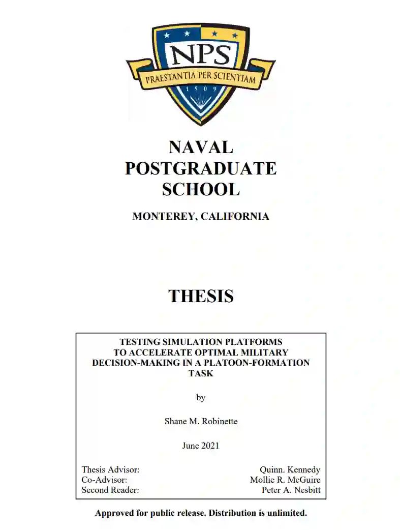 训练一名步兵军官在军事行动中选择合适的排阵型,传统上需要大量的训练资源。步兵训练将受益于在普遍可用的平台上进一步发展高容量的训练。2018年,创建了一个基于计算机的模拟排级编队决策任务(PFDT),并利用认知与绩效目标训练干预模型(CAPTTIM)来确定哪些参与者达到了最佳决策以及何时发生。本研究在该工作的基础上,在两个流行的平台上完善和测试PFDT。PFDT包括32个场景,每个场景随机呈现四次,总共128次试验。在这些场景中,有五个因素被操纵,确认了最佳、可接受和差的决策反应。基础学院和海军研究生院的27名学生在三种平台中的一种完成了PFDT:平板电脑、虚拟现实(VR)或带编队的VR(为参与者提供在虚拟背景上描绘编队的能力)。CAPTTIM表明,在达到最佳决策所需的试验数量上不存在平台效应。此外,参与者的经验水平并不影响专家或新手在对方之前达到最佳决策。因此,PFDT是一个可行的军事训练模拟器,无论所使用的技术平台或步兵训练的数量如何。