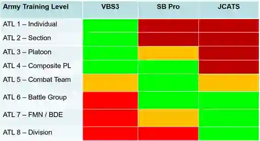陆军使用三个软件平台开展基于虚拟和建构模拟的训练。它们是虚拟战斗空间 3 (VBS3)、钢铁野兽专业版 (SB PRO) 和联合冲突与战术模拟 (JCATS)。这三个程序或程序的组合可实现包括 ATL 7 在内的训练。下表提供了每种模拟适合支持的训练级别的基本概况。值得注意的是,平台之间存在重叠,在这种情况下,培训目标将影响使用哪种模拟软件。