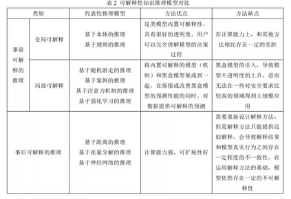 根据不同的划分标准,知识推理模型可以被划分成不同的类别。其中,根据解释产生的方法,可以将 推理模型划分为两大类:事前可解释和事后可解释[41,62,96,97,102,118]。其中,事前可解释模型主要指不需要额 外的解释方法,解释蕴含在自身架构之中的模型。事后可解释性是指模型训练后运用解释方法进行推理过 程和推理结果的解释,解释方法自身是不包含在模型里面的。一种方法被看作能够对黑盒模型进行解释, 是指该方法可以:(1)通过可解释和透明的模型(例如,浅决策树、规则列表或者稀疏线性模型)对模型 的行为进行近似,可以为模型提供全局的可解释;(2)能够解释模型在特定输入样例上进行预测的原因;(3)可以对模型进行内部检查,了解模型的某些特定属性,譬如模型敏感性或深度学习中神经元在某一特 定决策中起到的作用[41] 。值得注意的是,可以将事后解释方法应用于事前可解释的模型上,例如,可以 从敏感性分析的角度对事前模型进行剖析。此外,根据可解释的范围大小----是否解释单个实例预测或整个 模型行为,可以将模型划分为局部可解释和全局可解释两大类[97,96];根据解释方法是否特定于模型,可以 将模型划分为特定于模型和模型无关两种类别[96] 。在接下来的内容里,本文按照解释产生的方式,对知 识推理模型进行总结和归类。