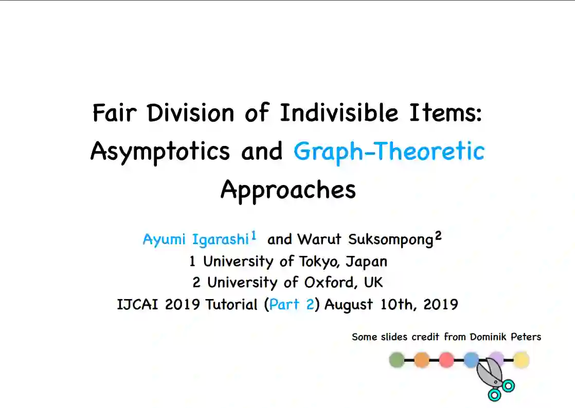 Ayumi Igarashi,是JSPS博士后研究员,自2019年4月起由东京大学的Satoru Iwata教授主持。在伊迪丝·埃尔金德教授的指导下,她完成了牛津大学计算机科学系的博士学位。她广泛的研究领域包括博弈论、组合优化和社会选择。她特别关注网络所带来的连接约束问题,特别是在各种情况下的公平和稳定概念的存在和复杂性,例如联盟形成游戏和不可分割项目的公平划分。