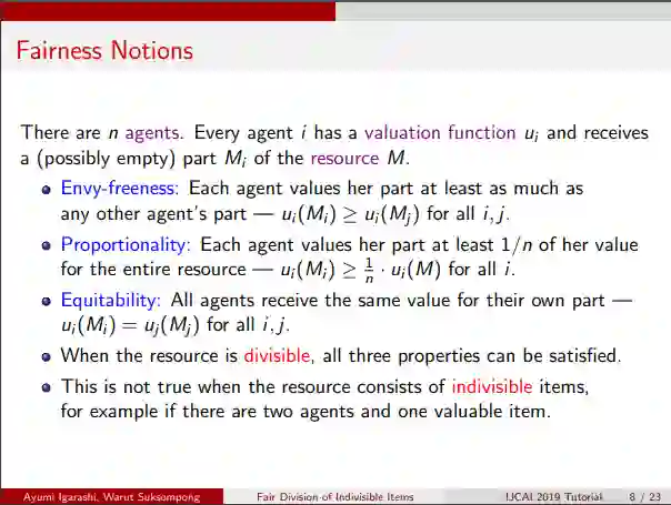 公平划分在过去十年中一直受到博弈论和人工智能界的关注,从公理和计算的角度来看。其目标通常是在感兴趣的代理之间分配资源,以便满足某些公平标准。公平分割的适用范围从解决离婚纠纷、分割遗产到分摊房租、分割家务等。该领域的早期工作主要集中在如何分配土地等可分割资源上。然而,在过去的二十年左右,特别是最近几年,人们对公平分配珠宝和艺术品等不可分割的资源产生了相当大的兴趣。这个设置在某些方面与可分割的设置有本质的不同,因此需要使用新的概念、技术和工具。