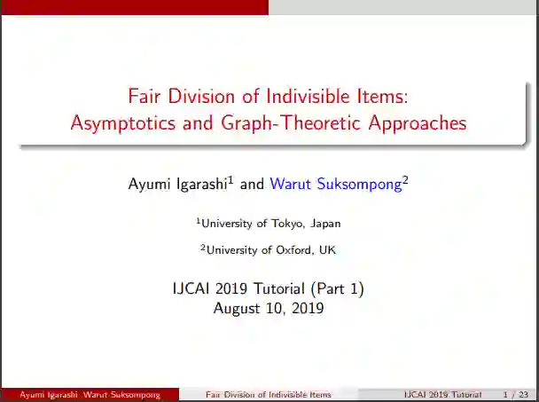 在本教程中,我们将首先介绍该地区新来者的公平分工。我们将概述不可分割项目及其属性的主要公平概念。然后,我们将介绍不可分割项目公平划分的两个新框架。首先,我们将给出渐近结果的调查:由于在不可分割的存在下,通常不能满足几个常见的公平概念,一个重要的问题是确定满足每个概念的分配可能在随机实例中存在的条件。我们将介绍概率论和匹配理论中解决这个问题所需的工具。其次,我们将概述最近在网络约束下不可分割项目的公平划分方面所做的工作。在一种情况下,网络描述项之间的物理或时间关系,而代理只对接收连接的项束感兴趣。在另一个场景中,网络描述的是代理之间的关系,而不是项目之间的关系,并要求每个代理都不要嫉妒她的邻居。我们将解释一些存在和复杂性的结果,以及基于可分割的蛋糕切割设置的经典参数的技术。最后,我们将讨论一些源于这些工作的开放性问题。