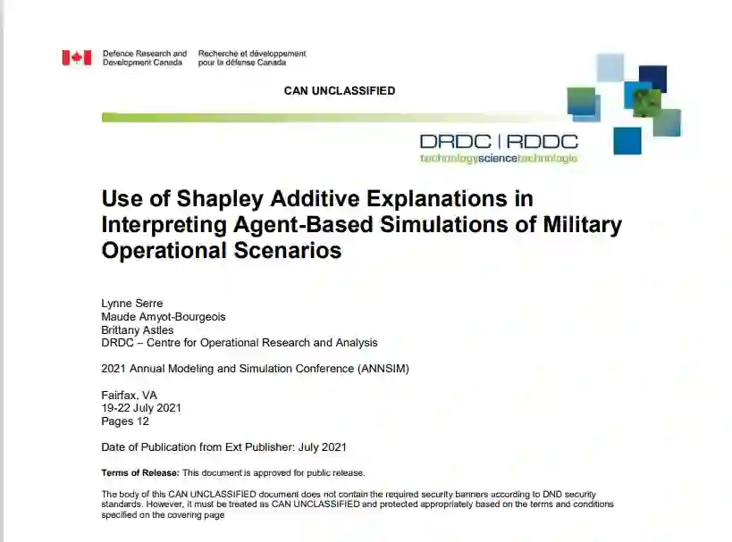 军事防御现代化规划通常涉及复杂的系统,必须了解这些系统,以便为设计、规划、实施和采购决策提供信息。为了获得对系统的基本了解并确定关键的初始参数,仿真实验可以用来在一个大型参数空间内有效地生成数据。虽然机器学习模型可用于模拟后的分析,以确定关键参数,但当目的是为决策者提供支持时,其可解释性和黑盒性质会带来挑战。在本文中,应用了一种可解释机器学习预测的模型诊断方法,称为沙普利加和解释(SHapley Additive exPlanations,SHAP),用于从基于Agent的模拟中获得数据,该模拟是一个军事作战场景。该场景是由加拿大陆军对其情报、监视和侦察资产进行现代化的举措所激发的,并对其进行了抽象化,以尽量减少建模系统的复杂性并验证SHAP的结论。
