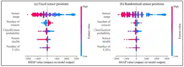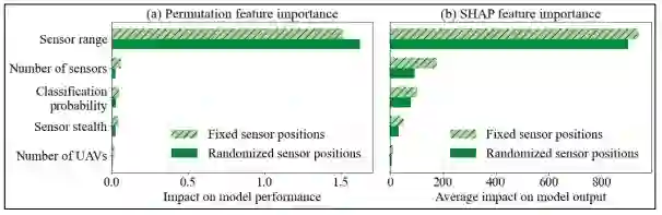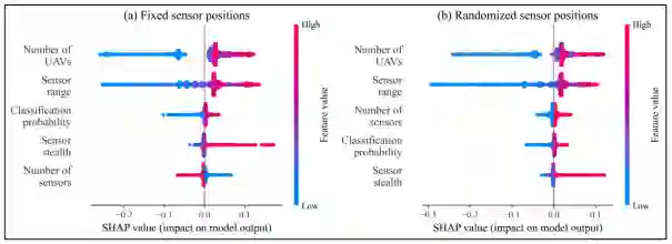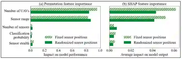图1和图2分别列出了第一个检测步骤的排列特征重要性和SHAP特征重要性,以及检测到的RF坦克的比例。这些方法在识别最重要的特征方面基本一致,尽管在某些情况下确切的排序有所不同,特别是在不太重要的特征中。在图1(a)中,传感器范围是预测第一个检测步骤的最重要特征。对于固定和随机的传感器位置,如果将传感器范围从随机森林模型中删除,R2将下降到零以下,表明性能比恒定模型差。在图1(b)中,传感器范围也是最重要的特征。对模型输出的幅度(即预测的第一个检测步骤)的平均影响由SHAP值的绝对值的平均值给出。尺度与目标,即第一个检测步骤的单位相同。在图2(a)中,有两个特征对预测探测到的红军坦克的比例很重要:无人机的数量和传感器的范围。请注意,这两个特征的重要性顺序对于固定和随机的传感器位置是不同的。在图2(b)中,同样的两个特征被SHAP方法确定为最重要。请注意,在这种情况下,无人机的数量对于固定和随机的传感器位置都是排在第一位的。