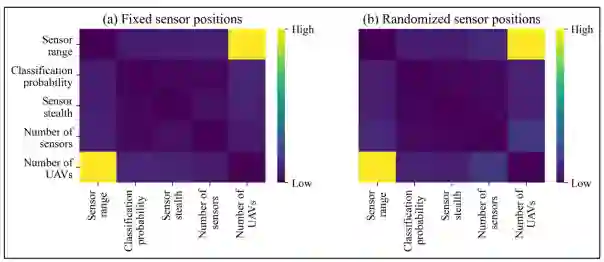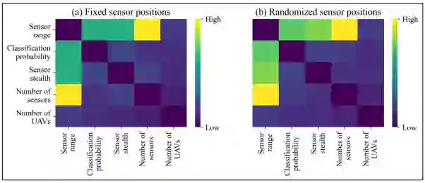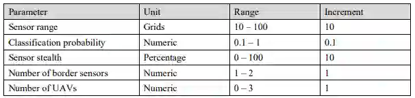 选择用于参数化的自变量是蓝军边界传感器的数量、蓝军边界传感器的探测和分类范围(称为传感器范围)、蓝军边界传感器探测到的特工被正确分类为红军或蓝军的概率(称为分类概率)、蓝军边界传感器对RF传感器的隐蔽程度(称为传感器隐蔽性),以及蓝军无人机的数量。实验设计遵循网格状结构,每个设计点重复进行一百次迭代。表2显示了参数的范围。