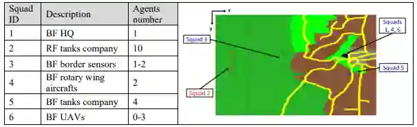 下面的表1列出了情景中包括的所有小队,以及每个小队的地形和初始位置的表述。红军试图到达蓝军总部(蓝军 HQ)。当红军向蓝军总部推进时,它进入了蓝军边境传感器的探测和分类范围。在MANA中,探测是指在某一位置感知到特工的存在,而分类是指将探测到的特工的忠诚度分为友军(蓝军)或敌军(红军)的行为。一旦探测到并被归类为敌方,边界传感器就会将探测到的特工的忠诚度和位置传达给边界总部,后者则提示4、5和6小队(列于表1)向确定的RF位置移动。4号和5号小队的任务是与红军交战,而由无人驾驶飞行器(UAV)组成的6号小队的任务是持续跟踪红军并提示蓝军总部进行间接火力支援。如果所有的红军都失去了能力,或者达到了最大的时间限制,模拟就会结束。