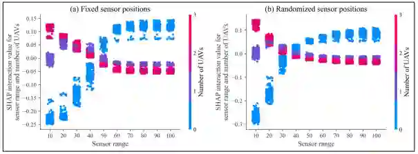 提出了标准的特征重要性柱状图,使用基于排列组合的算法和SHAP值进行计算,强调这些图对模型行为的洞察力有限。虽然这两种计算特征重要性的方法在确定预测两个感兴趣的MOE的前一或两个特征方面基本一致,但SHAP总结图、交互值和依赖图对随机森林模型的行为提供了更多的了解。SHAP总结图显示了模型的预测对不同特征值的变化(例如,随着传感器范围的缩小,预测的第一个探测步骤平稳增加),并确定了极端值的影响(例如,高传感器的隐蔽性可以大大增加探测到的红军坦克的比例)。SHAP的交互值和依赖性图提供了进一步的洞察力,以了解所发现的两个最重要的特征对探测到的红军坦克比例的综合影响。SHAP还成功地识别了固定和随机传感器位置之间的关键差异,证实了在确定传感器组合时,位置,而不仅仅是传感器的数量,是一个重要的考虑。使用SHAP可以验证所发现的见解,因为模拟场景被有意抽象化,以尽量减少其复杂性并保持对战场动态的直观理解。这意味着可以根据对实施的直接了解或通过在MANA中交互运行模拟来查看Agent的行为来确认这些见解。
