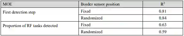 表3总结了每个MOE以及固定和随机传感器位置的随机森林回归器的性能。在所有情况下,随机森林模型都明显优于常数模型,后者的R2为零。对于第一个检测步骤,固定和随机传感器位置的特征变量解释了MOE中80%以上的变异。对于检测到的红军坦克的比例,拟合度没有那么强,固定传感器位置的特征变量解释了MOE中略高于60%的变异,随机传感器位置的特征变量解释了MOE中略低于60%的变异。