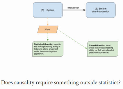 下图将观察到的因果推论与标准统计进行了对比。 在标准统计问题中,我们具有由某些系统生成的数据,并且我们希望使用该数据来推断系统的某些属性。 在观察性因果推论中,我们要使用一个系统(在某些干预之前的系统)生成的数据来推断另一系统(在干预之后的系统)的属性。 这就要求我们对这两个系统之间的关系做出假设(或等效地,干预如何改变原始系统),并对这些假设进行建模,以确定从系统A采样的哪些数据可以告诉我们有关系统B的信息。