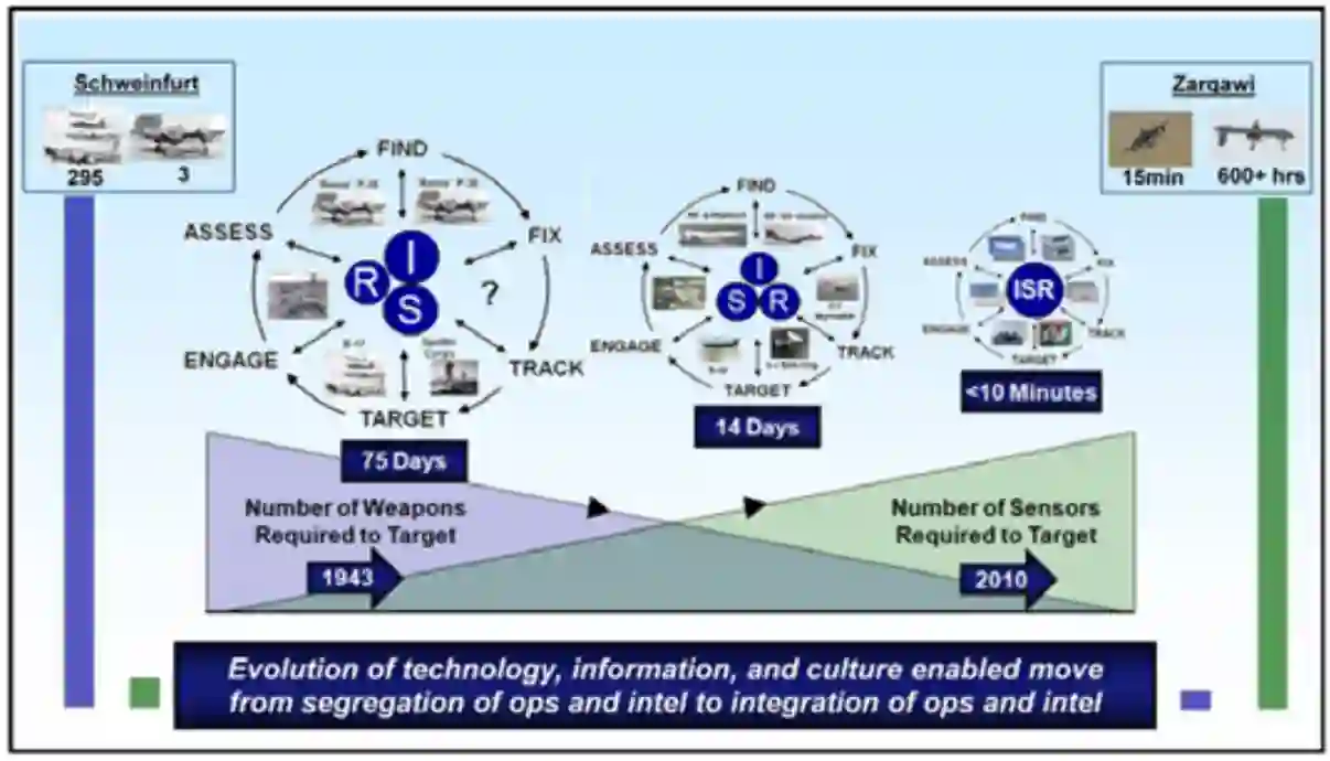 反恐战争的特点,加上信息革命对精确目标定位的创新,使美国空军的工作重心从投放弹药量转向对 ISR 收集的需求。1943年10月14日,施韦因富特(Schweinfurt)空袭纳粹德国,293架轰炸机需要3小时的情报支持,而2006年阿布-穆萨布-扎卡维(Abu Musab al-Zarqawi)空袭,15分钟的出动需要600多个小时的情报支持。精确打击需要精确情报,这就将人力负担从飞行行动转移到处理、利用和分析上,以促进打击行动。由于认识到为提高打击能力而对情报的需求不断增加,因此收集平台、传感器和带宽都在稳步大幅增加,以支持 "后送 "行动,但人力却不一定相应增加,无法在规定时间内分析大量收集的情报,为行动提供便利。与此同时,重点转向 "后方 "作战,再加上信息时代作战的优势和弱点,进一步模糊了历史上对前方和后方作战区域的划分,使这一作战环境概念对现代兵力而言成为过时的概念。