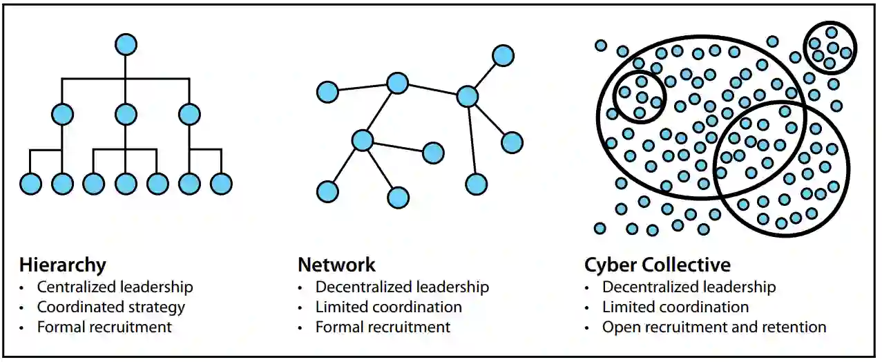 过去十年的反恐和反叛乱行动使美国空军情报分析员精通于监控和评估冲突地区的恐怖网络,特别是伊拉克的基地组织和阿富汗与塔利班有关联的组织。然而,赛博集体是一个独特的挑战。赛博集体缺乏集中的指挥结构,而是主要通过在线社区规范和价值观来运作。它们的成员是开放的,没有正式的招募或保留机制,其战略规划也微乎其微。大多数赛博集体倾向于抵制任何人成为其集体的领导者或发言人;有影响力的人可能会在有限的时间内出现,但成员的开放性和多样性使得任何人都无法在不分裂集体的情况下长期出现。由于成员人数有限,意识形态单一,小型社区可能会形成较强的内部等级制度,但这也限制了大型集体的全球覆盖面和影响力。图 3 简要说明了等级制度、网络和赛博集体之间的区别。
