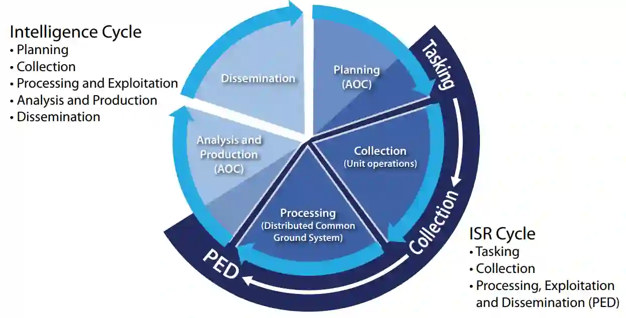 美国空军情报工作面临的另一个挑战/机遇是情报与 ISR 的混淆。美国国防部将 ISR 定义为 "为直接支持当前和未来行动,对传感器、资产以及处理、利用和传播系统的规划和操作进行同步和整合的活动。这是一种综合的情报和行动职能"。尽管它是情报与行动的结合,但它只是整个情报周期的一个子集。如图 5 所示,任务分配是规划过程的最后部分,通过 ATO 向各单位分配需求,而收集和 PED 则反映了 PCPAD 周期的这些阶段。
