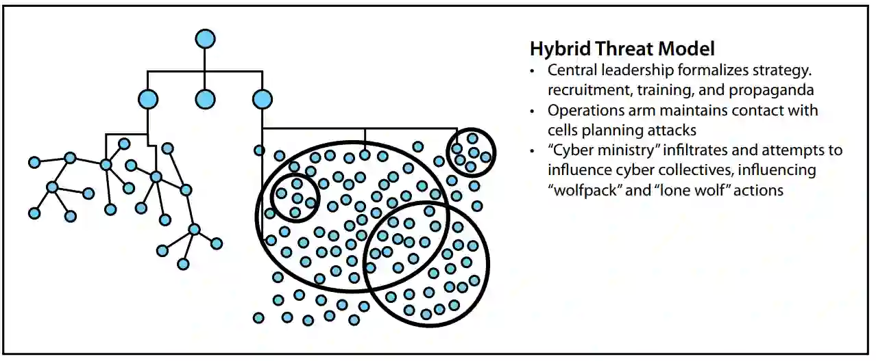这种新的分布式组织给情报机构带来的挑战是,作为多管齐下战略的一部分,对集体进行渗透的前景,其目的是同时通过深层国家的攻击破坏对手的稳定,同时通过网络和等级组织对地方政府集中式更有组织和战略性的暴力。图 4 说明了这种混合模式的可能形式,由一个中央战略领导核心指挥多个部门的行动,包括招募、宣传、培训、直接行动、与网络的协调以及对赛博集体的在线宣传渗透。由于这些网络广泛多样,传统的网络制图是不可能实现的,因为它们的变化速度非常快,信息通过赛博集体共享的速度也非常快。要识别网络中的影响者,需要大数据解决方案来跟踪信息流量,识别哪些主题可能成为趋势,哪些信息可能在哪些领域被接受,并识别这些信息中可能预示攻击策略变化(大规模枪击、撞车和下一次威胁演变)的趋势变化。这种对敌方组织和信息的了解程度对于在作战层面及以上直接打击敌方至关重要,但对于兵力保护的战术指示和警告可能更为重要。