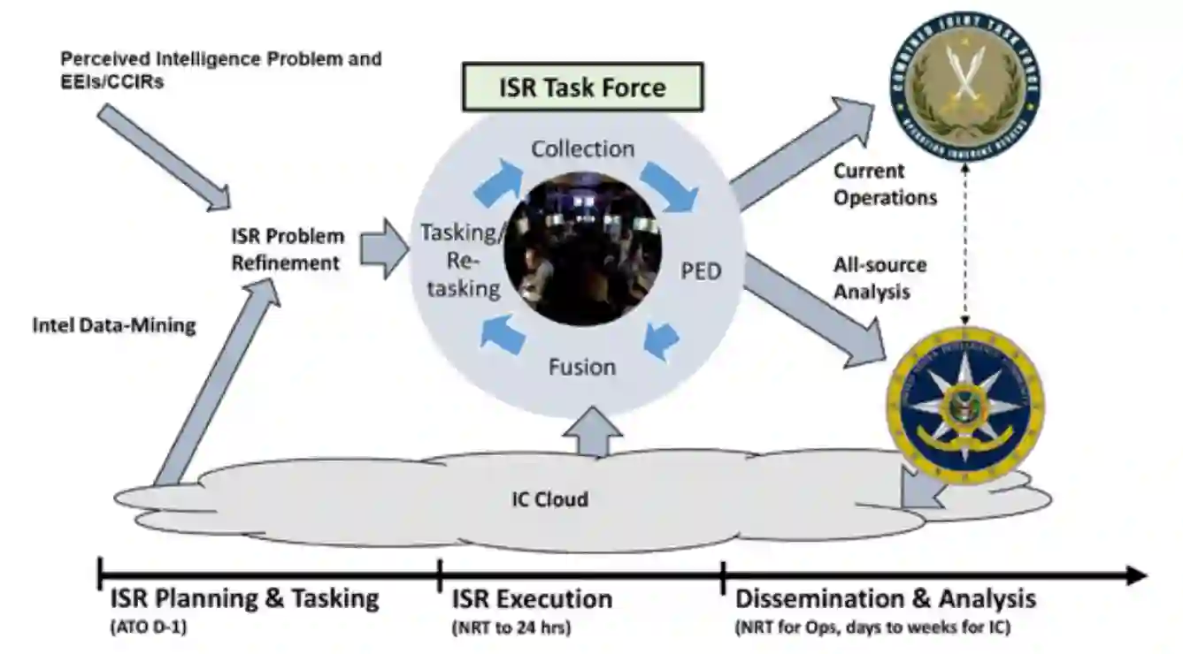 这种模式建立了情报分析的基础设施,在评估国家行为者方面证明是有效的,但其时间顺序的特点实际上给空军的 ISR OODA 循环带来了限制因素。ISR 规划是通过 72 小时 ATO 任务分配周期执行的,并受收集管理流程的制约,根据该流程,在执行 ATO 任务之前,指挥官对收集目标(需要成像或以其他方式收集的地点)的优先级进行排序和堆叠,并通过董事会或裁判的优先级排序流程进行排序和堆叠。随后是分析流程,美国空军的作战级分析可能需要数天时间,而国家机构的全资源制作则需要数周时间。从 ISR 的角度来看,这与美国空军的灵活性原则相悖,该原则应使 ISR 操作人员能够将 ISR 效果集结并机动到作战环境的关键点,以便在时间、空间和目的上进行整合。此外,由于 ISR 来源日益复杂,基础情报数据和信息的储备也在增加,未来制定优先情报需求、指挥官关键信息需求和其他情报收集请求的传统模式不太可能继续成为确定收集资产优先次序的有效手段。