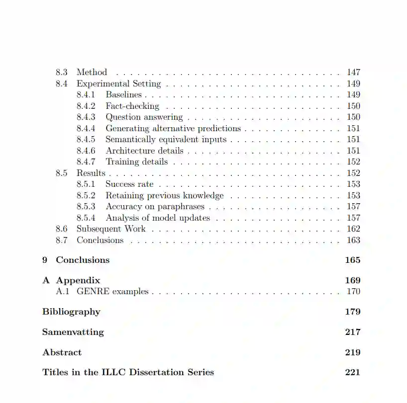为此,在第七章中,我们介绍了一种新的事后解释技术,用于检查神经模型各层决策的形成方式。我们的系统学习屏蔽向量子集,同时保持可微性。这不仅让我们能够绘制归因热图,还能分析决策在网络层中的形成方式。我们使用该系统研究了BERT模型(Devlin等,2019a)在情感分类和问答任务中的表现,并展示了该技术也可以应用于第三章提出的基于图的模型。最后,我们还提出了一种可以用于编辑语言模型中实体事实知识的方法,从而在无需昂贵的重新训练或微调的情况下修复“错误”或意外预测(第八章)。