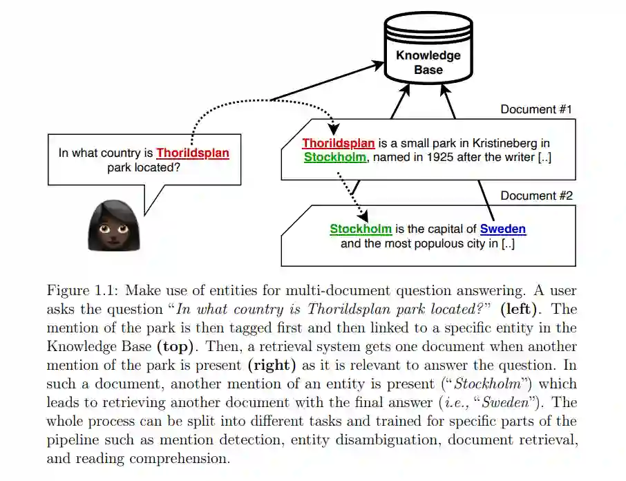 让我们从一个利用实体进行多文档问答的例子开始。在这种情况下,用户向信息系统提出问题,该系统需要在文档库中搜索答案。此外,我们假设需要跨多个文档进行分析和推理,因为在单个文档中找不到简单的答案。图1.1展示了在这种情况下获得答案的机器辅助过程。正如我们从中看到的那样,机器进行的过程旨在模仿人类的行为,这似乎是一种合理的策略。我们假设将这种复杂任务分解为可学习的子步骤会导致整体系统的改进和人类可解释性。我们可以使用客观指标来验证这一任务是否如此。