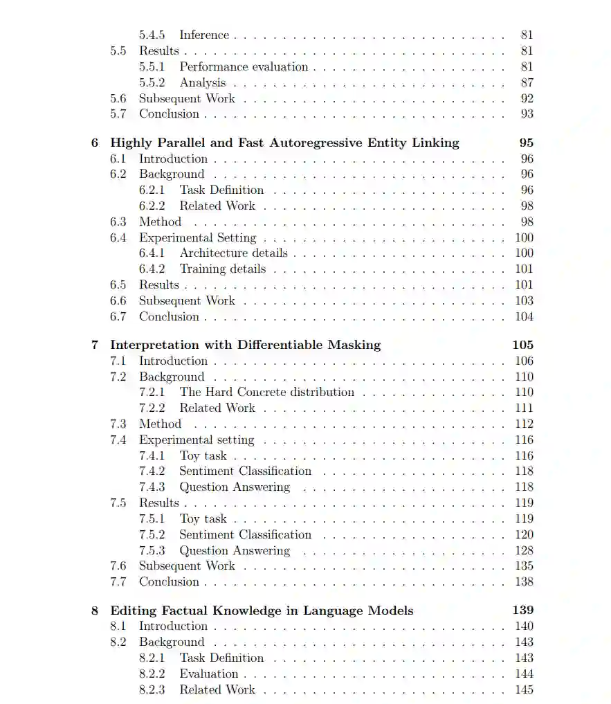 贡献 本论文的主要贡献可总结如下: 1. 我们引入了一种依靠在多个文档内外传播的信息进行推理的神经模型。我们将其框定为图上的推理问题。实体提及是该图的节点,而边则编码了不同提及之间的关系。 1. 我们提出了一个系统,通过生成实体的唯一名称(自回归方式)来识别文本中的实体并将其链接到外部知识库中,支持100多种语言。我们采用受限生成方法,将这种生成自回归模型用作分类器。 1. 我们提出了一种新的事后解释技术,用于检查神经模型各层决策的形成方式。 1. 我们开发了一种方法,可以编辑语言模型内部的实体事实知识,从而在无需昂贵的重新训练或微调的情况下修复“错误”或意外预测。