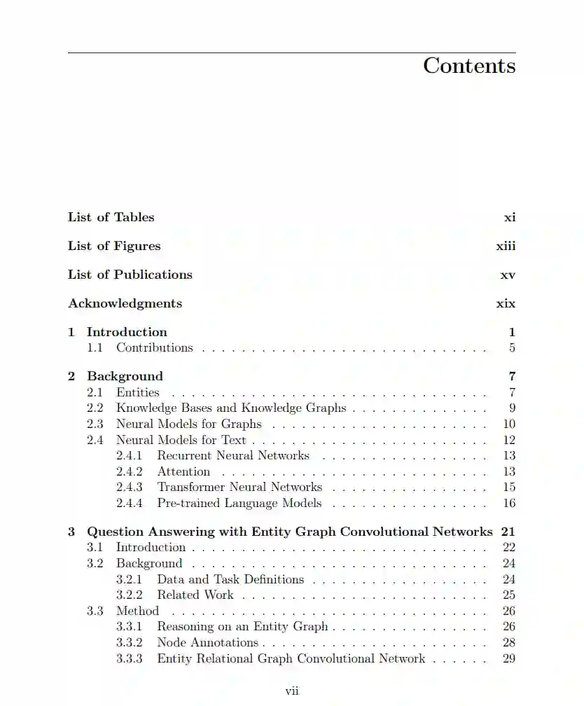 用于自然语言理解的实体 为了研究上述问题,在第三章中,我们探讨了如何利用实体来解决自然语言理解(NLU)。我们引入了一种依靠在多个文档内外传播的信息进行“推理”的神经模型。我们的假设是,通过引用实体进行“推理”(学习)步骤使模型输出预测,将使其学会处理复杂问题的合理且更具普遍性的策略。文本中出现的实体提及进行了注释,这使得测试我们的假设变得更容易。然后,我们将任务框定为图上的推理问题。这些提及是图的节点,而边则编码了不同提及之间的关系(例如,文档内和跨文档的共指关系)。图卷积网络(GCN)应用于这些图,并经过训练以执行多步推理。我们展示了使用额外的实体信息可以实现一种可扩展且紧凑的方法,在开发时(即2018年)在一个流行的多文档问答数据集WikiHop上取得了最先进的结果。 第三章的发现为更有趣的问题打开了大门,因为我们贡献的一个限制因素是所有实体的提及都作为输入提供给模型。检索文本中实体提及的能力对于知识密集型任务(如开放领域问答和对话)至关重要。因此,一个自然的问题出现了:我们如何利用语言模型来识别和消歧文本中的实体?
