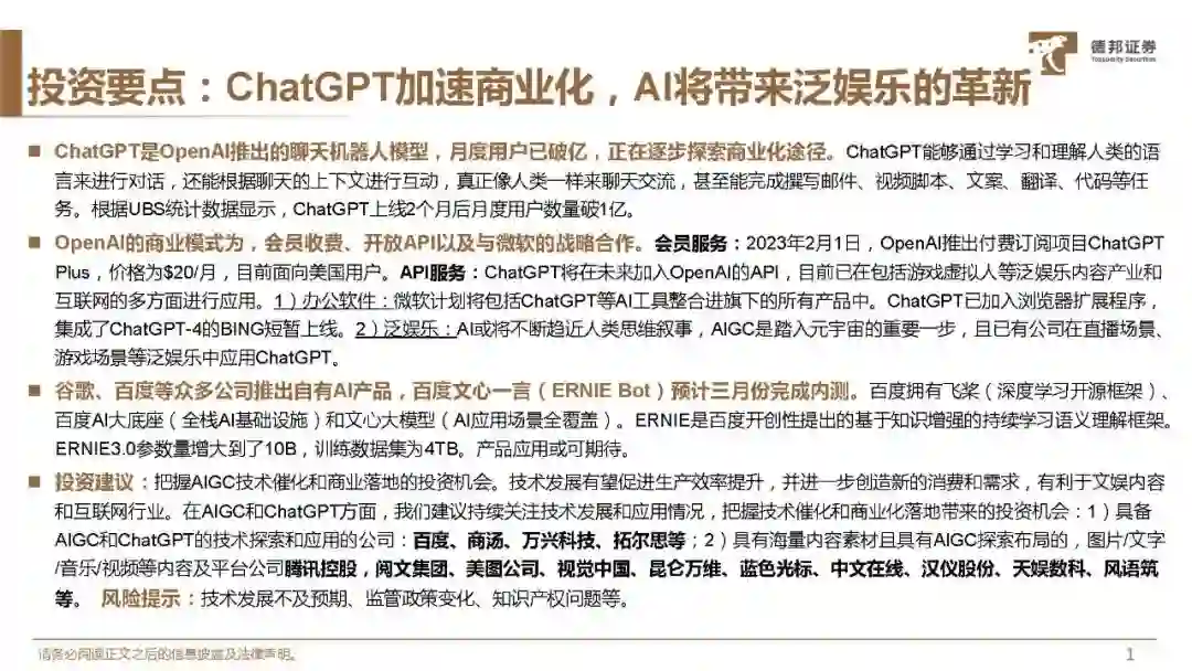 ChatGPT 专题| ChatGPT报告:从ChatGPT到生成式AI:人工智能新范式,重新定义生产力,100页pdf ChatGPT是OpenAI推出的聊天机器人模型,月度用户已破亿,正在逐步探索商业化途径。ChatGPT能够通过学习和理解人类的语言来进行对话,还能根据聊天的上下文进行互动,真正像人类一样来聊天交流,甚至能完成撰写邮件、视频脚本、文案、翻译、代码等任务。根据UBS统计数据显示,ChatGPT上线2个月后月度用户数量破1亿。 OpenAI的商业模式为,会员收费、开放API以及与微软的战略合作。会员服务:2023年2月1日,OpenAI推出付费订阅项目ChatGPTPlus,价格为$20/月,目前面向美国用户。API服务:ChatGPT将在未来加入OpenAI的API,目前已在包括游戏虚拟人等泛娱乐内容产业和互联网的多方面进行应用。1)办公软件:微软计划将包括ChatGPT等AI工具整合进旗下的所有产品中。ChatGPT已加入浏览器扩展程序,集成了ChatGPT-4的BING短暂上线。2)泛娱乐:AI或将不断趋近人类思维叙事,AIGC是踏入元宇宙的重要一步,且已有公司在直播场景、游戏场景等泛娱乐中应用ChatGPT。 谷歌、百度等众多公司推出自有AI产品,百度文心一言(ERNIEBot)预计三月份完成内测。百度拥有飞桨(深度学习开源框架)、百度AI大底座(全栈AI基础设施)和文心大模型(AI应用场景全覆盖)。ERNIE是百度开创性提出的基于知识增强的持续学习语义理解框架。ERNIE3.0参数量增大到了10B,训练数据集为4TB。产品应用或可期待。
