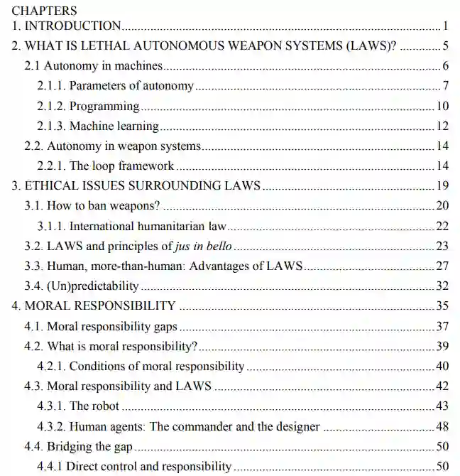 本论文研究了致命自主武器系统(LAWS)的伦理影响。论文的重点是致命性自主武器系统是否会导致责任差距的问题。责任差距论点认为,没有人对致命自主武器系统的行为承担责任,从而导致责任分配上的差距。然而,引入了替代责任的概念,证明由于伦理纠葛,致命性自主武器系统的设计者可以对其设计承担伦理责任。本论文的中心论点是,有可能将伦理责任(尽管是替代意义上的责任)归于致命性自主武器系统的设计者,从而弥合责任差距。