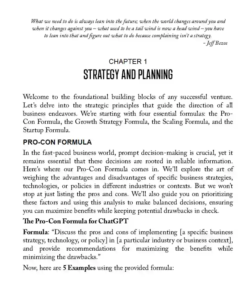 介绍:“ChatGPT商业手册:用于商业成功的AI驱动策略和公式” 无论您是在优化现有业务、开创创业项目,还是为未来的商业领导奠定基础,这本逐步指导的手册承诺提供宝贵的洞察、实用工具和带清单的可行步骤。 导航商业世界可能很具挑战性,对吧?这就是我们手册的用处,它就像您在这多样化领域的指南针。基于OpenAI的ChatGPT动力构建,它探索了从策略和规划到创新和创业的所有商业领域。 这不仅仅是另一本商业书籍,这个工具包为您提供了经过试验和测试的公式、富有洞察力的提示和为各种规模的企业设计的AI增强策略。 每一章更深入地探讨关键的商业领域,提供清晰、实用的建议和AI驱动的洞察,帮助您克服挑战并培育成功。 您将访问当前的商业策略,它们被简化成易于消化的段落,使您能够管理从运营和销售到财务风险和新兴技术的一切。 但这本手册不仅停留在理论上;它规划了将AI纳入您日常商业任务的实际步骤。它是商业进化新时代的钥匙,促使您超越传统管理,探索创新方式以驱动成功并维持增长。 “ChatGPT商业手册”是您在这个动态商业环境中的秘密盟友。 如果您可以: ✓ 快速地在商业世界中导航吗? ✓ 在问题升级之前即刻解决商业问题? ✓ 控制您的财务风险并将它们转化为机会? ✓ 为您的企业配备延长其寿命和成功的赢家策略? ✓ 使用AI优化的策略在您的企业中推动创新? “ChatGPT商业手册”使这一切成为可能,甚至更多。重点是您,您的需求,以及这本手册如何满足它们。您准备好了吗? 内容有哪些? 第1章:策略与规划✓ 第2章:商业运营 第3章:销售与市场 第4章:财务与风险 第5章:创新与技术 第6章:行业与市场分析 第7章:领导力与组织文化 第8章:可持续性与知识产权(IP)管理 第9章:人力资源与员工发展 第10章:客户服务与支持 第11章:法律与监管合规 第12章:供应链与物流 第13章:分析与商业智能 第14章:产品开发与管理 第15章:创业与小企业