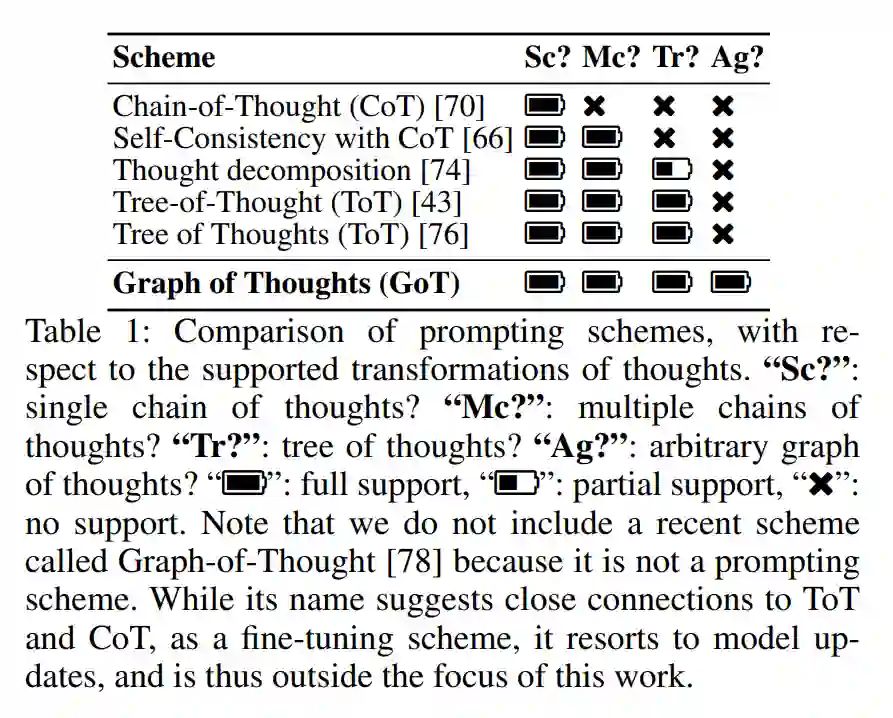我们展示了GoT的几个用例(排序、汇总的关键字计数、集合操作、文档合并),并详细说明了如何使用基于图的范例来实现它们(贡献#3)。我们评估GoT,并展示了其相对于现有技术的优势(贡献#4)。总的来说,我们观察到,GoT特别适合那些可以自然分解为较小的子任务的任务,这些子任务分别解决,然后合并为最终解决方案。在这里,GoT优于其他方案,例如分别在排序质量方面,相对于CoT和ToT分别提高约70%和62%,同时将ToT的成本减少了>31%。我们在表1中定性地将GoT与其他提示方案进行比较。 GoT是唯一一个能够在提示中启用任意基于图的思维转换的方案,例如聚合,包括所有先前提出的方案。