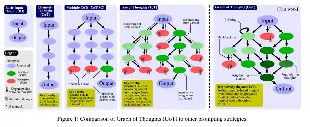 在这项工作中,我们认为,通过使LLM思维形成任意的图结构,可以实现更强大的提示。这是由诸如人类推理、大脑结构或算法执行等多种现象所激发的。当人类在研究一个新想法时,不仅会遵循一条思维链(如在CoT中),或尝试不同的独立思维(如在ToT中),而实际上会形成一个更复杂的思维网络。例如,人们可以探索一定的推理链,回溯并开始新的推理,然后意识到先前链中的某个想法可以与当前探索的思维相结合,并将它们合并为一个新的解决方案,发挥它们的优势,消除它们的弱点。同样,大脑形成复杂的网络,具有类似图的模式,如递归[28]。执行算法也暴露出网络化的模式,通常用有向无环图表示。相应的图启用的转换在应用于LLM思维时,带来了更强大的提示的希望,但这在CoT或ToT中不能自然地表达。
