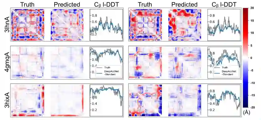 本文工作中,作者提出了DeepAccNet框架,DeepAccNet对以残基为中心的原子坐标进行3D卷积,将详细的残基信息与其他单独的残基以及残基对的信息集成在一起。实验结果表明, DeepAccNet可以提供先进的蛋白质模型精度预测,并且可以将它们进一步用于预测带符号的距离误差,指导蛋白质结构模型优化。