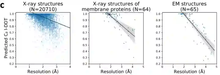 一种有效的精度预测方法应该有助于评估和识别实验确定的结构和计算模型中的潜在误差。文章研究了网络对X射线晶体学、核磁共振波谱学(NMR)和电子显微镜(EM)所确定的实验结构的性能表现,结果显示对于高分辨晶体结构,DeepAccNet预测的Cβ l-DDT分数接近于1.0,而对于较低分辨率的结构预测结果有所下降。