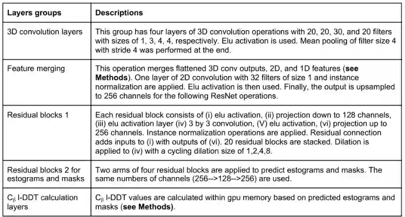 **3D convolution layers:**体素化原子坐标经过一系列的三维卷积层,其参数在各残基间共享,这些卷积运算生成描述蛋白质中每N个残基的局部三维环境特征。由该卷积层产生的输出经过扁平化处理成为每个残基的一维向量并与其他一维特征进行连接。 **Feature merging:**匹配特征维数并进行二维卷积运算。通过特征矩阵运算,每对残基既有该对残基的二维输入特征,又有两个单独残基的一维特征这种数据表示可以对骨干链和成对的相互作用进行卷积。 **Residual blocks:**连接后的特征矩阵进入一个残块数量为20的残差网络,之后网络分支成两部分,分别用来预测所有残基对的Cβ距离误差分布(estograms)和阈值为15Å的Cβ接触图(masks)。根据estograms和masks的概率分布预测,计算每个残基Cβ的局部距离差异测试(l-DDT)分数。