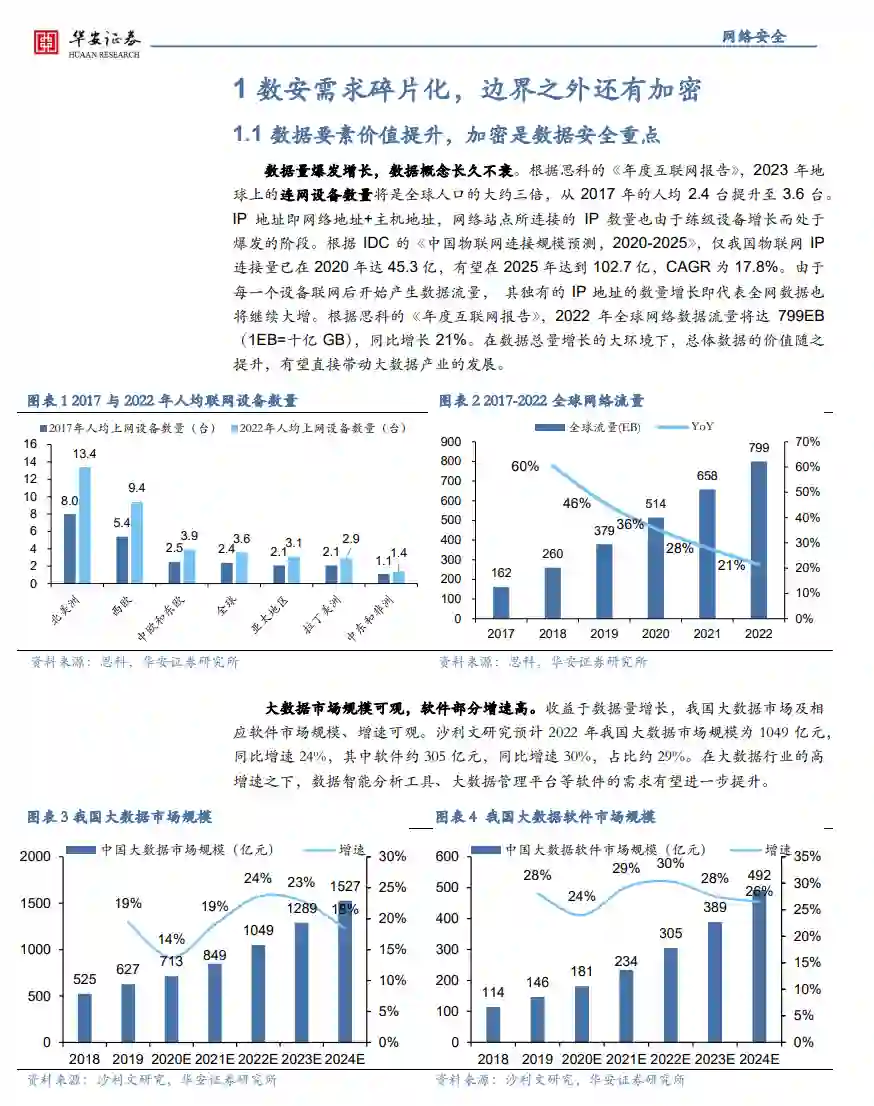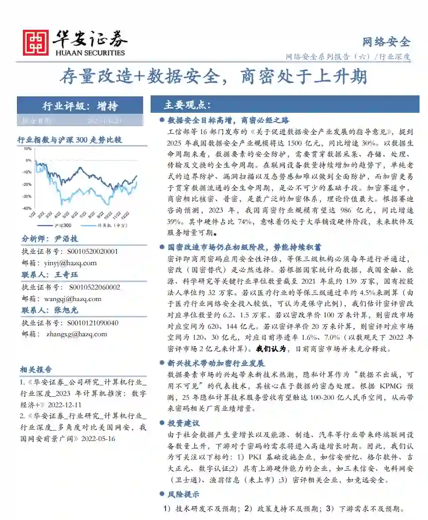 数据安全目标高增,商密必经之路 工信部等16部门发布的《关于促进数据安全产业发展的指导意见》,提到2025年我国数据安全产业规模将达1500亿元,同比增速30%。以数据生命周期来看,数据要素的安全防护,需要贯穿数据采集、存储、处理、传输及交换的全生命周期。在联网设备数量持续增加的趋势下,单纯老式的边界防护、漏洞扫描以及态势感知难以做到全面防护,而加密更易于贯穿数据流通的全生命周期,是必不可少的基础手段。加密赛道中,商密相比核密、普密,是最广泛的加密体系,理论价值最大。根据赛迪咨询预测,2023年,我国商密行业规模有望达986亿元,同比增速39%。其中硬件占比74%,意味着仍处于大举铺设硬件阶段,未来软件及服务增量可期。 国密改造市场仍在初级阶段,势能持续积蓄 密评即商用密码应用安全性评估,等保三级机构必须每年进行并通过,密改(国密替代)是必然选择。若根据国家统计局数据,我国金融、能源、科学研究等关键行业单位数量截至2021年底约139万家,国有控股法人单位约32万家。若以医疗行业的等保三级通过率约4.5%来测算(由于医疗行业网络安全投入较低,可认为是保守比例),我们估计密评密改对应单位数量约6.2、1.5万家。若以密改单价100万来计算,则密改市场对应空间为620、144亿元。若以密评单价20万来计算,则密评对应市场空间为120、30亿元,对应目前渗透率1.6%、7.0%(以数观天下2022年密评市场2亿元来计算)。我们认为,目前商密市场并未充分释放。 新兴技术带动加密行业发展 数据要素市场的兴起带来新技术热潮,隐私计算作为“数据不出域,可用不可见”的代表技术,其核心在于数据的密态处理。根据KPMG预测,25年隐私计算技术服务营收有望触达100-200亿人民币空间,从而带来密码相关厂商业绩增量。 投资建议 由于社会数据产生量增长以及能源、制造、汽车等行业带来终端联网设备数量上升,下游对于密码的需求将进入高速增长时期。因此,我们认为可关注以下标的:1)PKI基础设施企业,如信安世纪、格尔软件、吉大正元、数字认证;2)具有上游硬件能力的企业,如三未信安、电科网安(卫士通)、渔翁信息(未上市);3)密评相关企业,如竞远安全。