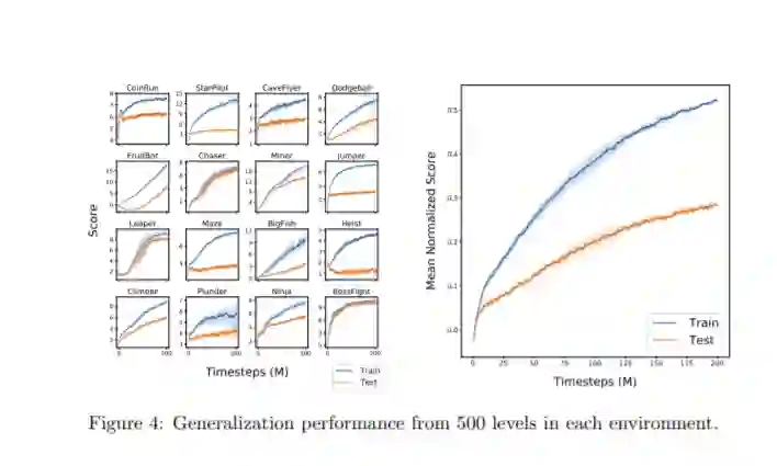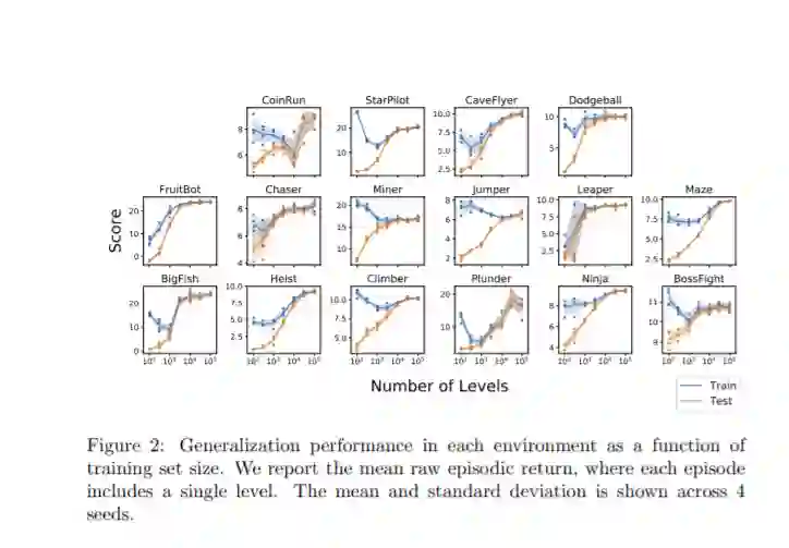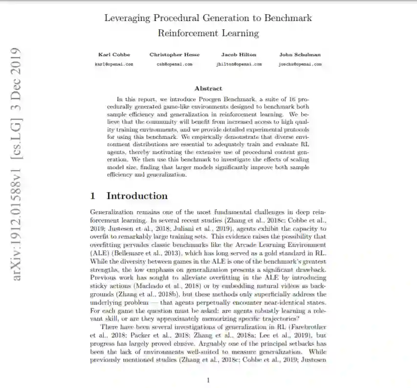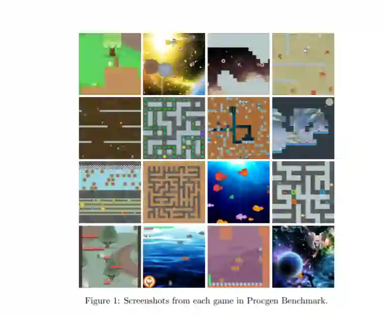在这份报告中,介绍了Procgen基准测试,这是一套由16个程序生成的类似游戏的环境,旨在对样本效率和增强学习中的泛化进行基准测试。我们相信社区将从高质量的培训环境中受益,我们提供了使用这个基准的详细实验协议。并且以经验证明,不同的环境分布对于充分培训和评估RL代理是至关重要的,从而激发了过程内容生成的广泛使用。然后,我们使用这个基准来研究缩放模型大小的影响,发现更大的模型显著地提高了样本效率和泛化。